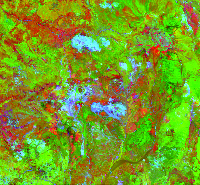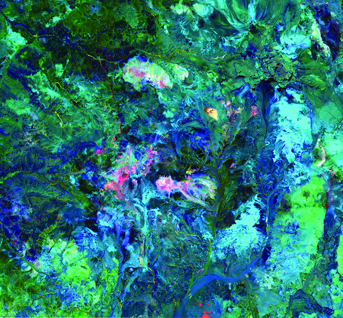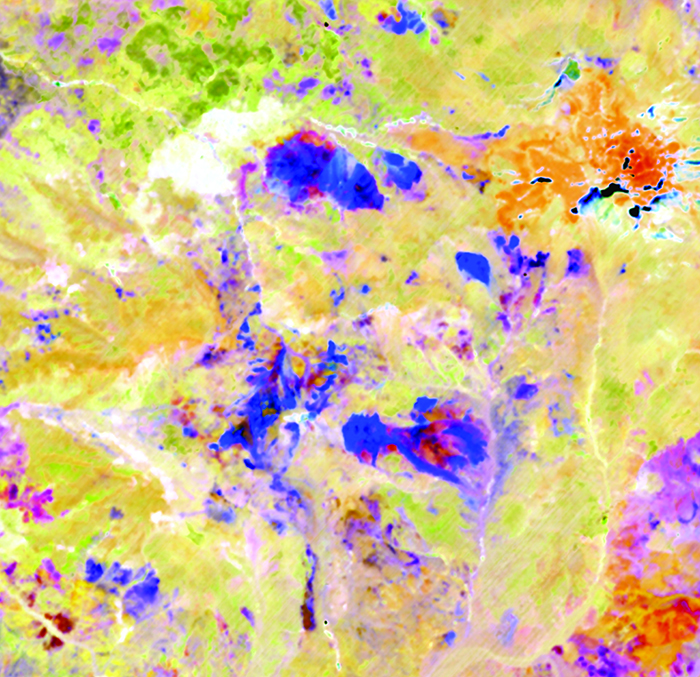 A combination of spectral indices is shown as RGB, which highlights changes in primary lithologies and alteration, especially clay minerals.